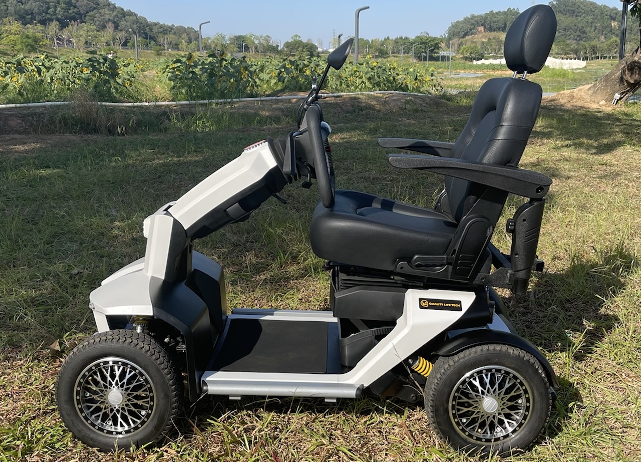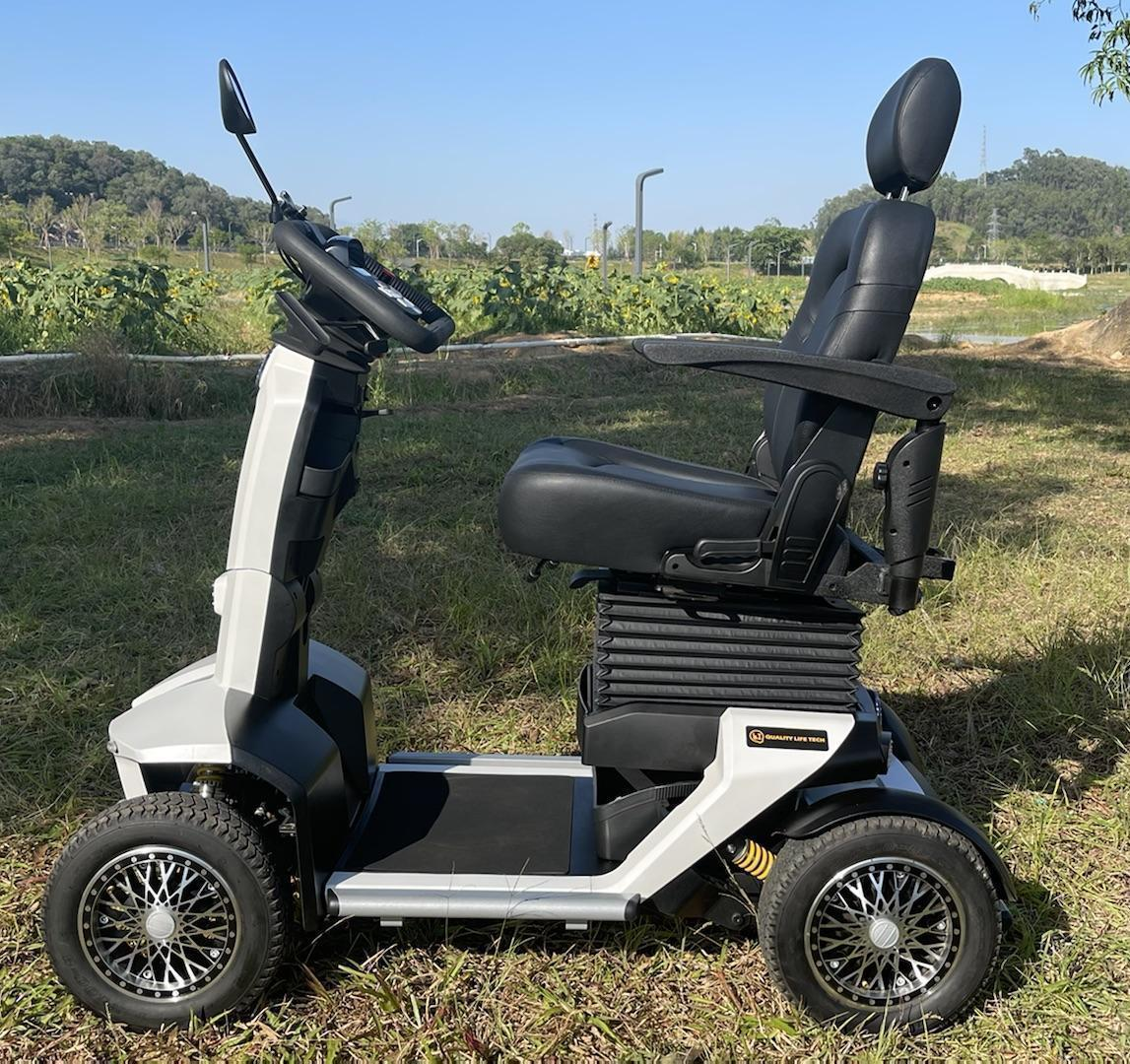 The Quality Life Technologies QS1231/1245 product family is the brand new designed and developed all-terrain out door electric mobility scooter basing on the domestic and overseas market demand and industry protential trends, which came out from the perspective of mobility aids industry and outside travel demands of senior citizens and disabled people from Quality Life’s marketing & RD department. The maximum user’s weight is 135 kg with maximum speed 15 kilo meters per hour, and 12 degrees maximum climbing slope. It comes with long-lasting maintain-free lithium iron phosphate battery which supports the driving range goes up to 60 kilo meters, and it desinged for long time, all-terrain, day and night out door using with ergonomic dash handle bar and throttle lever, tiller handle adjustments, seating system adjustments, full suspension and deluxe day and night lighting kit. The overall all new clean, modern, Cyber Deco styling looking solve the unfriendly, unhealthy looking essentially, give consumers a refreshing using experience and confidence whith cann’t be found in the traditional mobility scooter styling.