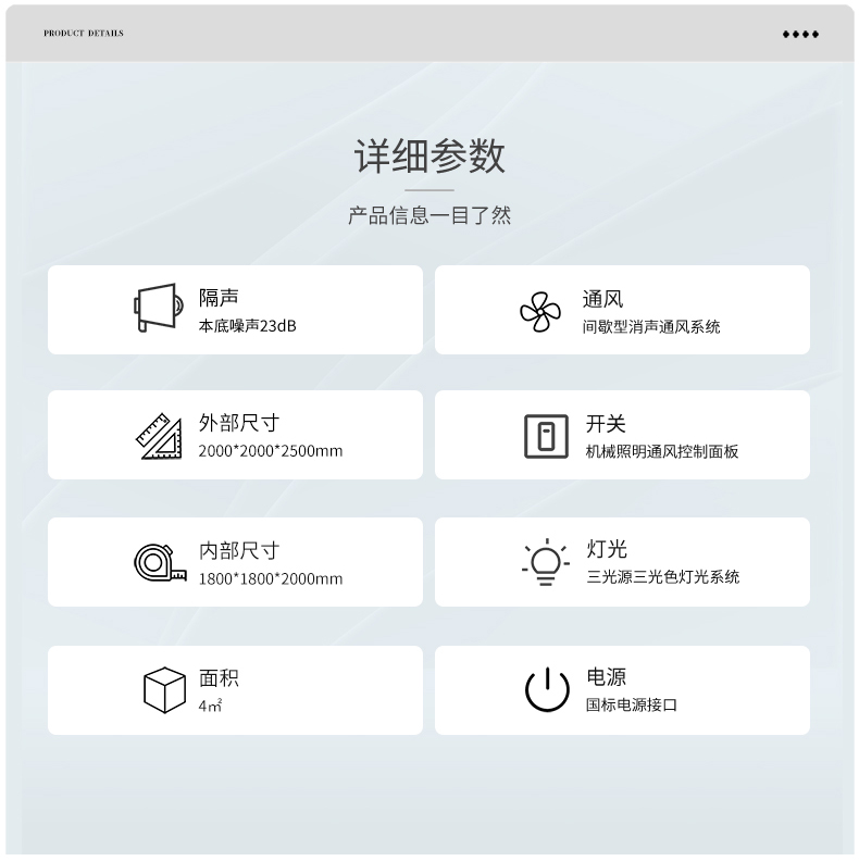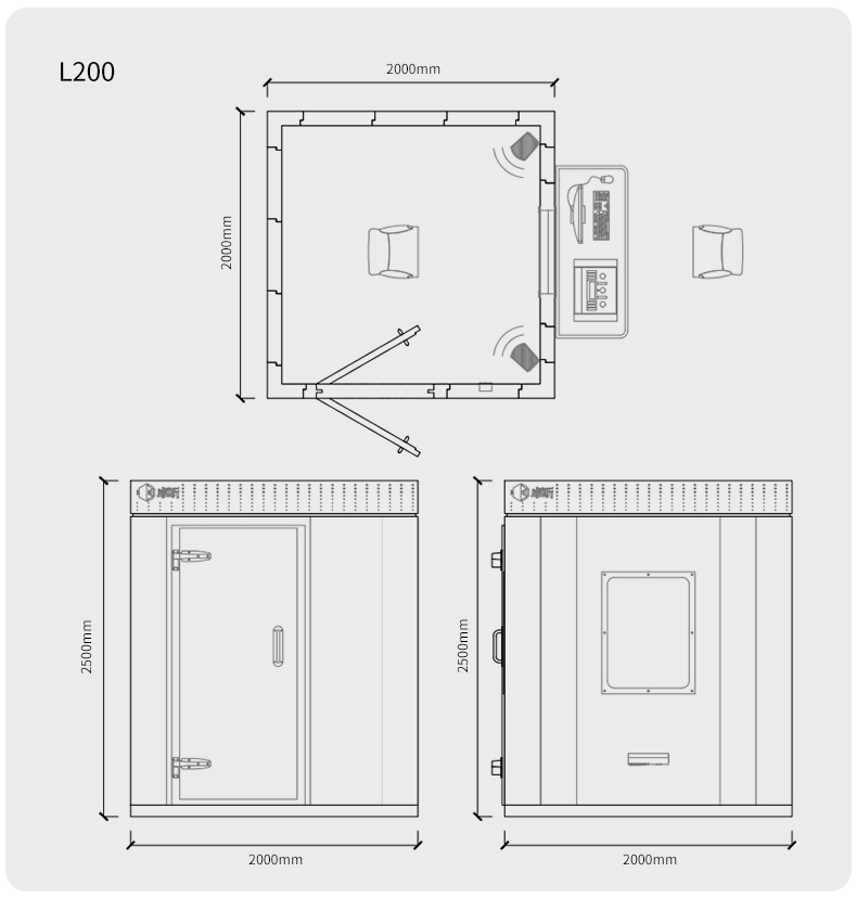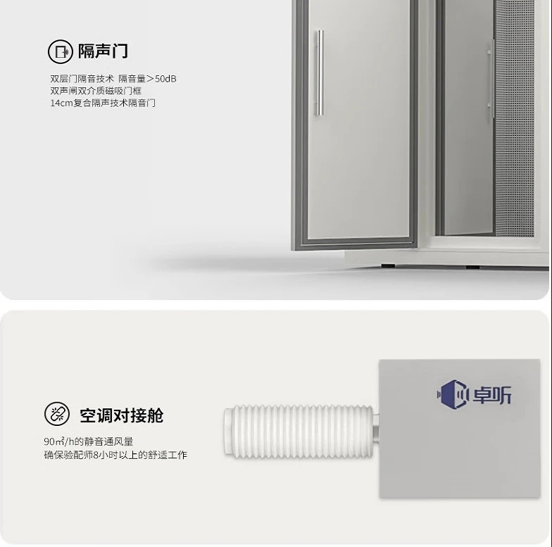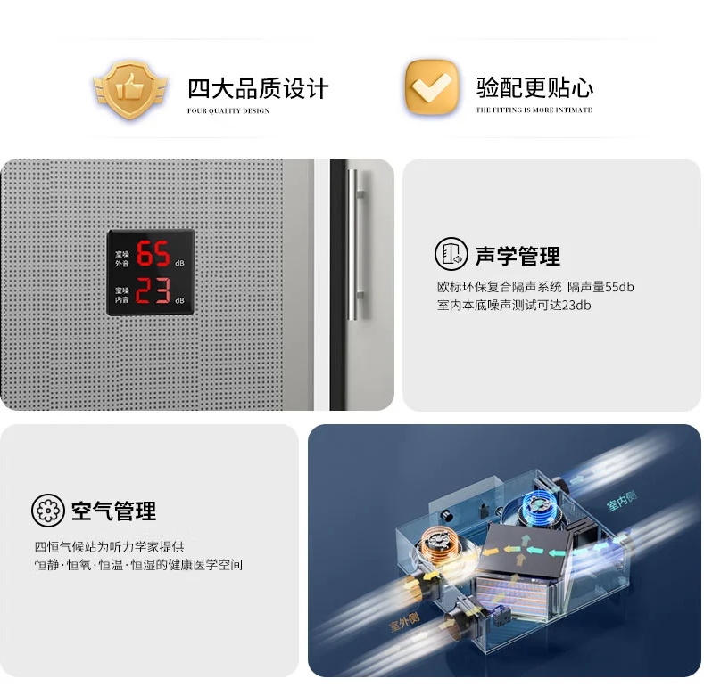Model:S80 Noise insulation:outdoor ambient noise ≤55dB (A), indoor background noise ≤23dB (A) Environmental protection:Formaldehyde release ≤0.4mg/L,meeting《Indoor decorating and refurbishing materials—Limit of formaldehyde emission of wood-based panels and finishing products》 Reference standard:JJF 1191-2019 《Calibration Specification for Acoustic Performance of Audiometry Rooms》 GB 3096-2022 《Environmental quality standards for noise》 GB 50325-2020 《Standard for indoor environmental pollution control of civil building engineering》 Applications:Pure tone audiometry, sound field assessment, impedance/vertigo detection