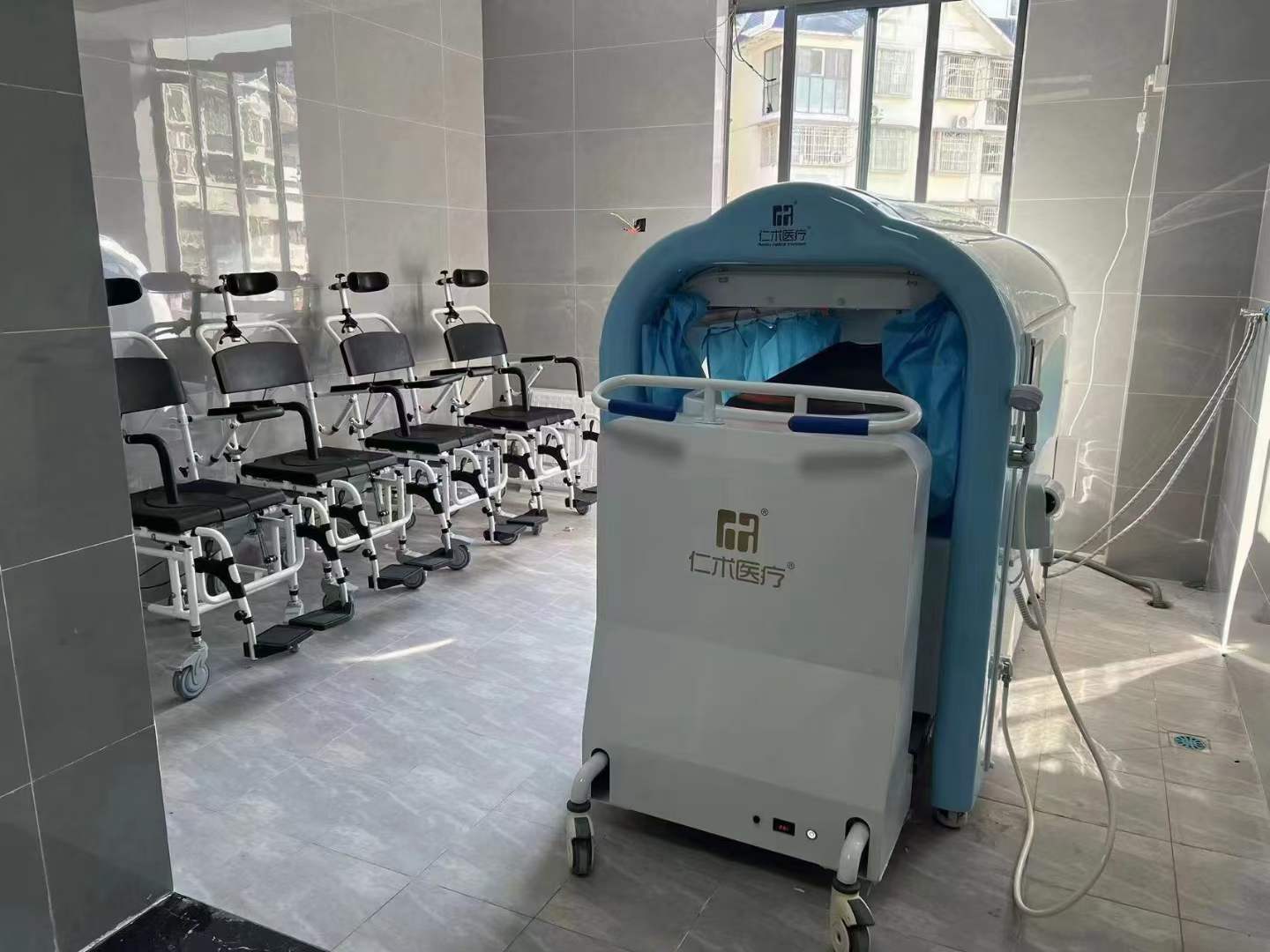 Barrier-free automatic bath machine is specifically designed for disabled, semi-disabled elderly individuals and postoperative rehabilitation patients. With one-button activation, it provides constant-temperature full-body cleansing. Its 25 electric omnidirectional spray heads combine with 250μm micro-particle hydrotherapy and music therapy to soothe emotions. The stainless steel + acrylic waterproof chamber features semi-transparent observation windows on both sides for easy care monitoring. Equipped with an automatic lifting trolley, water-electric separation system, and dual leakage protection, it ensures effortless transfer. Post-washing warm air drying and head drying are provided, along with ozone-ultraviolet dual disinfection and self-cleaning pipes. Certified with CE, listed in the National Rehabilitation Assistive Devices Catalog, and compliant with the latest national standards, this device is suitable for hospitals, nursing homes, communities, and households.