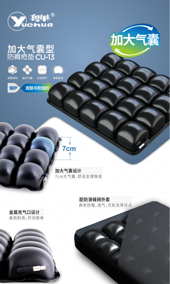Experience Value With the cushion,you may enjoy the long sitting due to italways keep your bottom cool and comfortable. Designed ldea The inflatable cushion is not only designed for decubitusprevention but also for household use. Every air cell isconnected to each other sharing the air flow. They can help tobalance the sitting pressure and position, keep your bottomcool and comfortable. With the cushion, you can sit for longertime with less pain.
