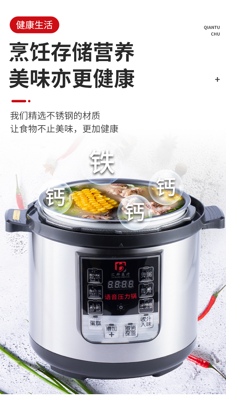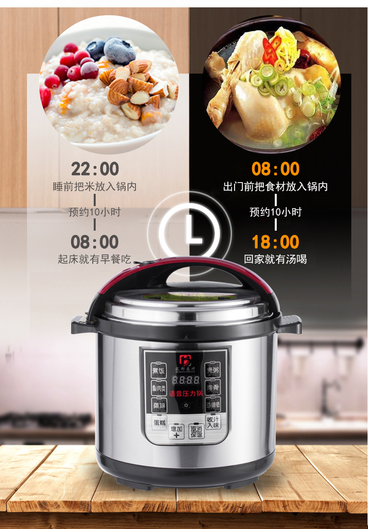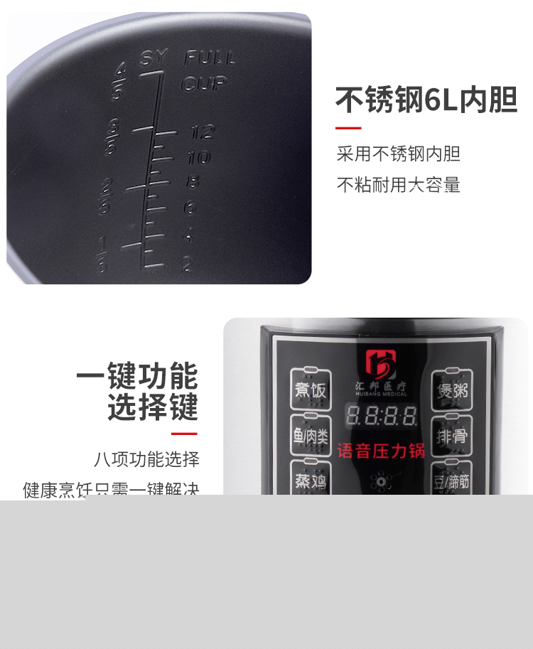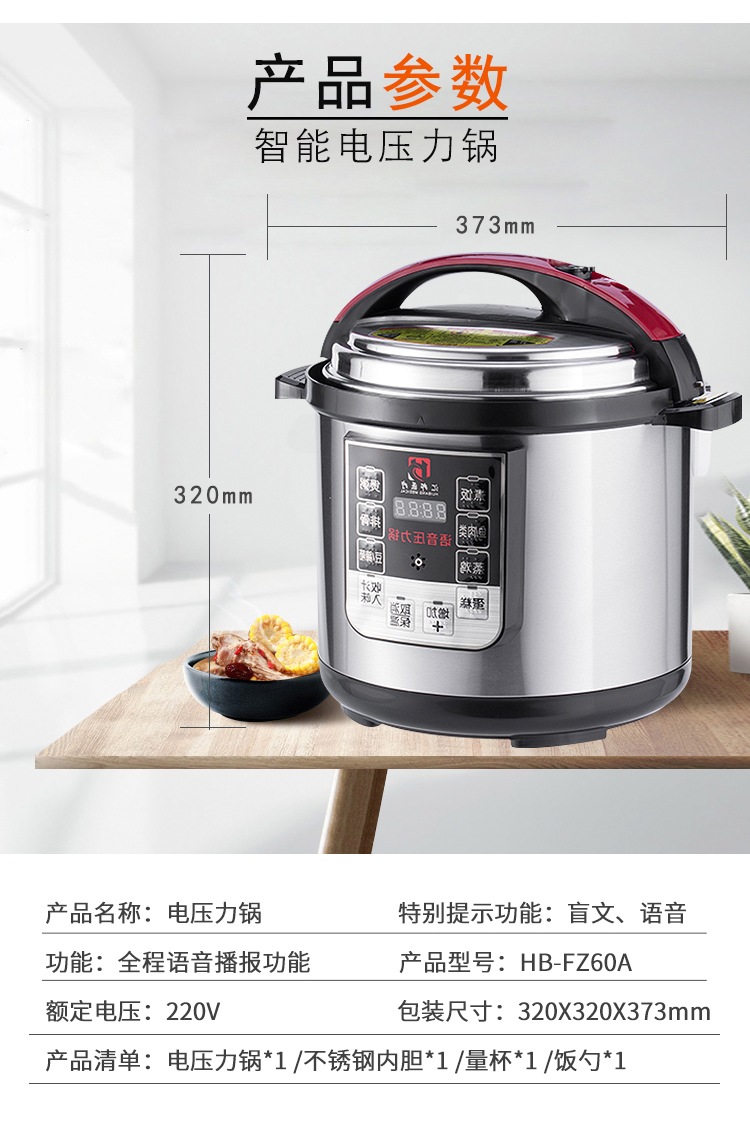 每一個(gè)操作按鍵都具有語音報(bào)讀功能,以及盲文點(diǎn)標(biāo)識(shí)和LED指示燈;具有LED四位數(shù)碼顯示屏,可顯示時(shí)間信息;材質(zhì):不銹鋼外殼,不銹鋼蓋子,食品級(jí)塑料蓋子防護(hù),鋁合金內(nèi)膽;具有一鍵式功能選擇鍵:具有煮飯、煲粥、魚/內(nèi)類、排骨、蒸雞、豆/蹄筋、蛋糕、收汁入味八種功能可選擇。