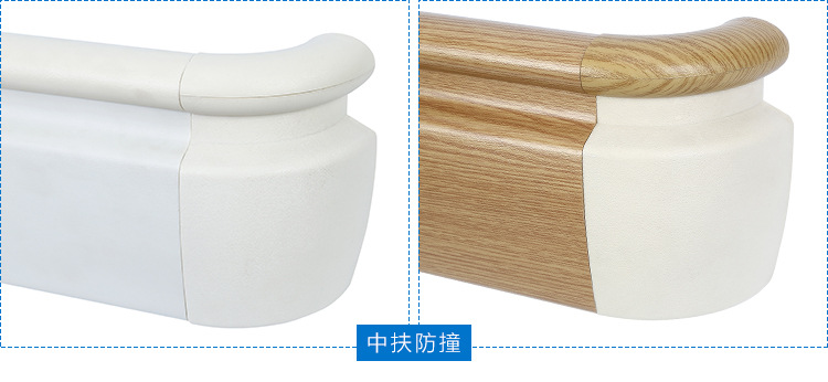 抗菌防撞扶手由抗菌PVC面板、優(yōu)質(zhì)鋁合金內(nèi)襯、彎頭、支撐架等組成;設(shè)計符合人體力學的要求,手握時有舒適感;表面PVC面板采用高分子抗菌材料,有防滑紋路,可抗菌、防污、不易變色,便于清潔,具有抗菌性、阻燃性、耐寒性等特性,產(chǎn)品經(jīng)國家權(quán)威機構(gòu)檢驗合格;整體色澤均勻,無明顯色差;扶手內(nèi)襯鋁型材,采用優(yōu)質(zhì)的鋁錠擠出成型,有堅固和防撞效果;扶手在每個轉(zhuǎn)角處有陰陽角連接配合,可使扶手的美觀無縫連接及保護墻面。