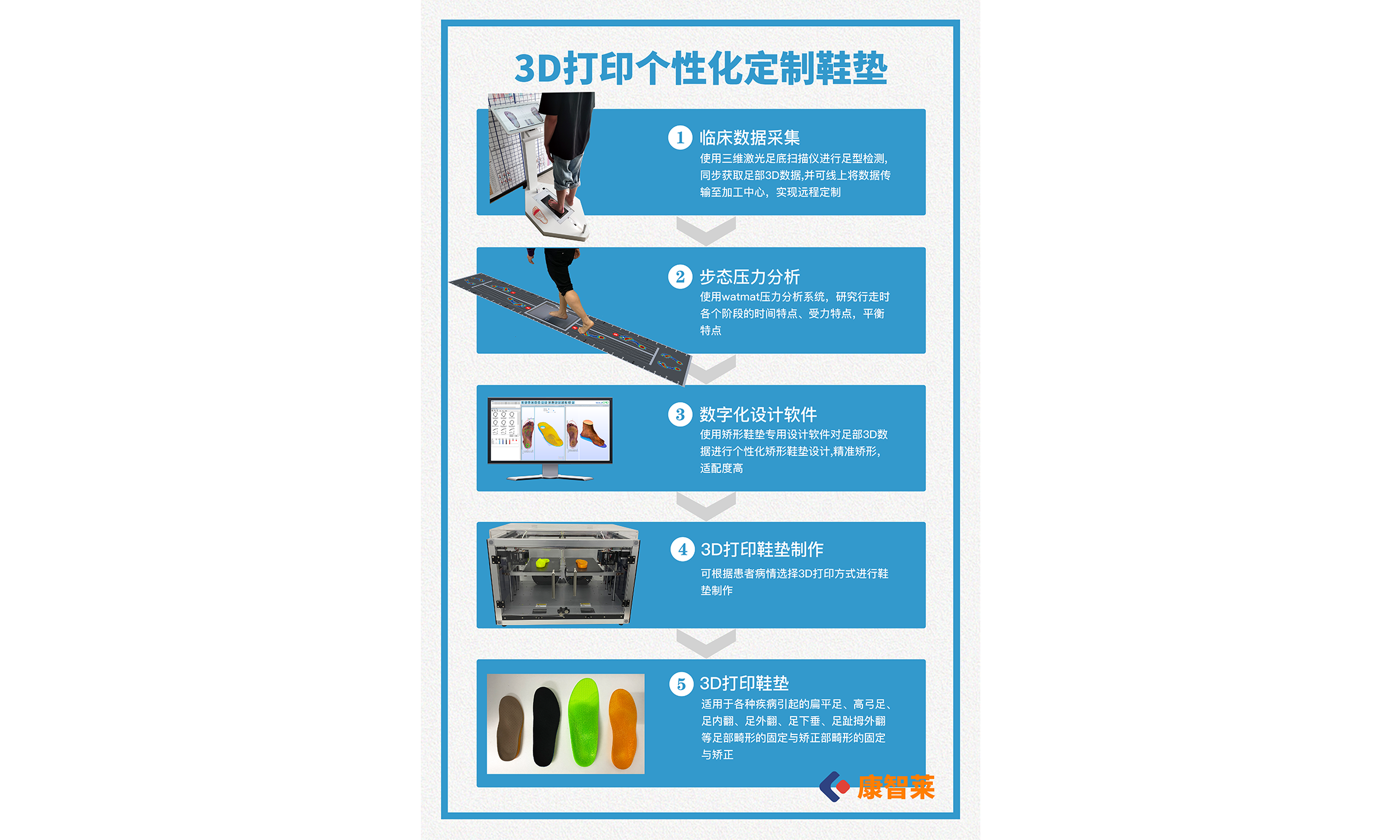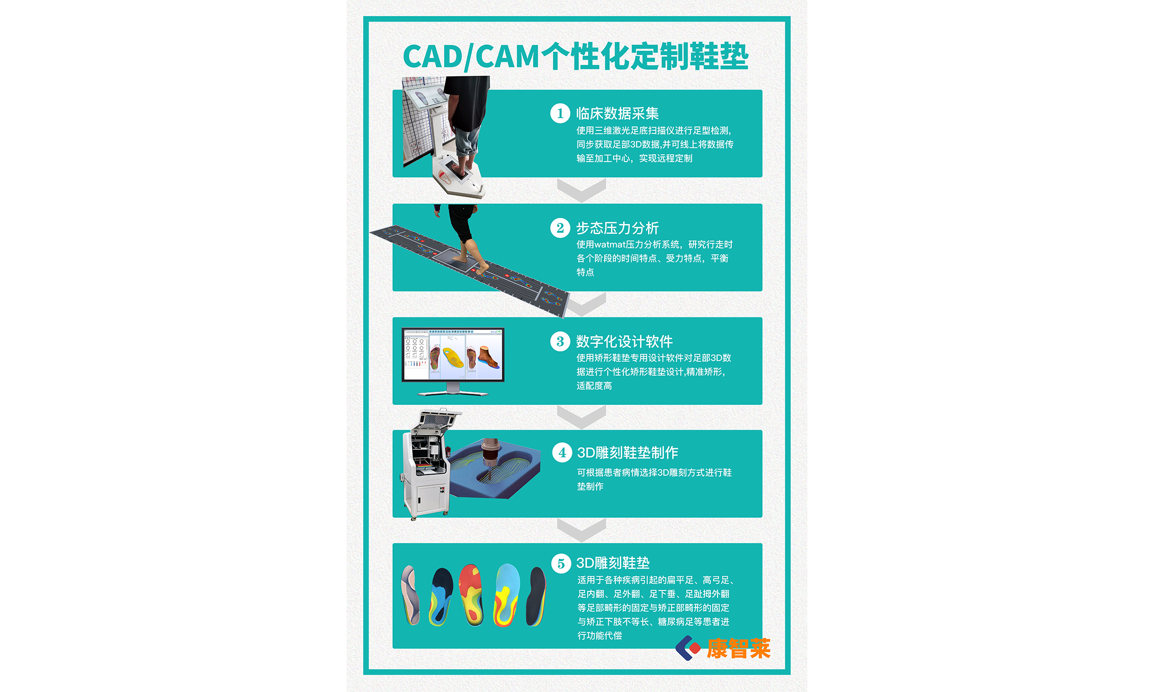 可為用戶提供包括矯形鞋墊CAD/CAM系統(tǒng),三維足底/腳型掃描儀,步態(tài)分析壓力儀,CNC機(jī)床,3D打印機(jī),鞋墊用EVA板材和表面抗菌材料等諸多產(chǎn)品在內(nèi)的矯形鞋墊全面解決方案:憑借專業(yè)的技術(shù),多年的服務(wù)經(jīng)驗和誠信的經(jīng)營理念,贏得了業(yè)界青睞2020年 ,成立康智萊科技,專注數(shù)字化足脊系統(tǒng)解決方案: 3D掃描系統(tǒng)、動態(tài)壓力系統(tǒng)CAD智能設(shè)計系統(tǒng)、3D打印系統(tǒng)、CNC雕刻系統(tǒng)等設(shè)備提供,系統(tǒng)技術(shù)、設(shè)計培訓(xùn)