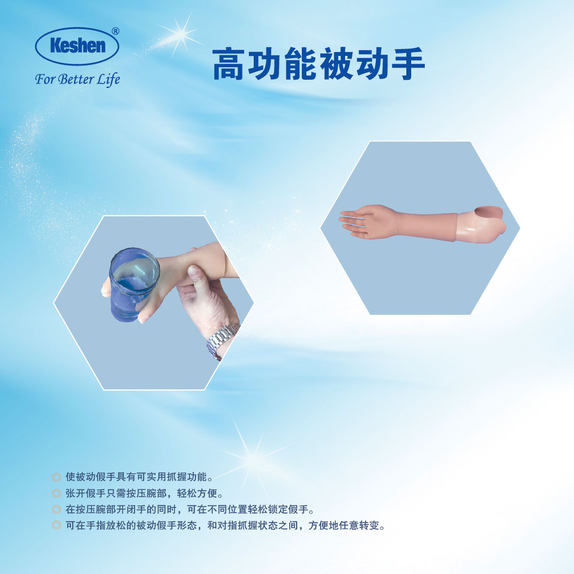 ◎使裝飾性假手具有可實(shí)用抓握功能。 ◎張開假手只需按壓腕部,輕松方便。 ◎在按壓腕部開閉手的同時(shí),可在不同位置輕松鎖定假手。 ◎手型可變,可在手指放松的裝飾性假手形態(tài),和對(duì)指抓握狀態(tài)之間,方便地任意轉(zhuǎn)變。 ◎由于手指可不同位置鎖定,使裝飾性假手能提物、騎車、用電腦和手機(jī)、持筆寫字。 ◎重量輕,不需電池,可下水,使用簡單方便。 ◎安裝方便與裝飾性假肢相同,便于大規(guī)模推廣。