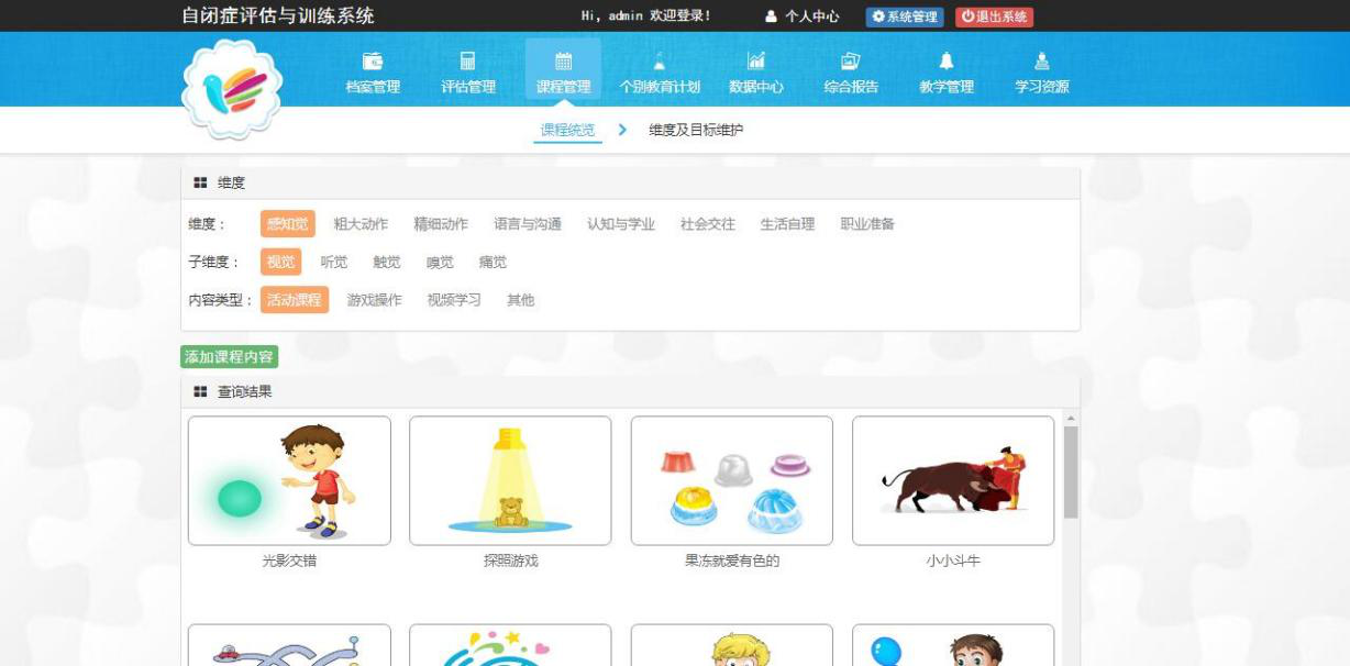 核心功能: 系統(tǒng)內(nèi)置了如:TTAP、C-PEP-3等國內(nèi)外權(quán)威的評估工具,涵蓋了從幼兒到成人的不同年齡階段的自閉癥人群的評估需求。并根據(jù)自閉癥人群的信息加工特點(diǎn)研發(fā)了感知覺、社會交往、語言溝通等八大維度的訓(xùn)練內(nèi)容,教師可以根據(jù)學(xué)生情況設(shè)置有針對性的課程,制定個(gè)別教育計(jì)劃,提高了教師的工作效率與工作質(zhì)量,搭建起家校溝通的橋梁。