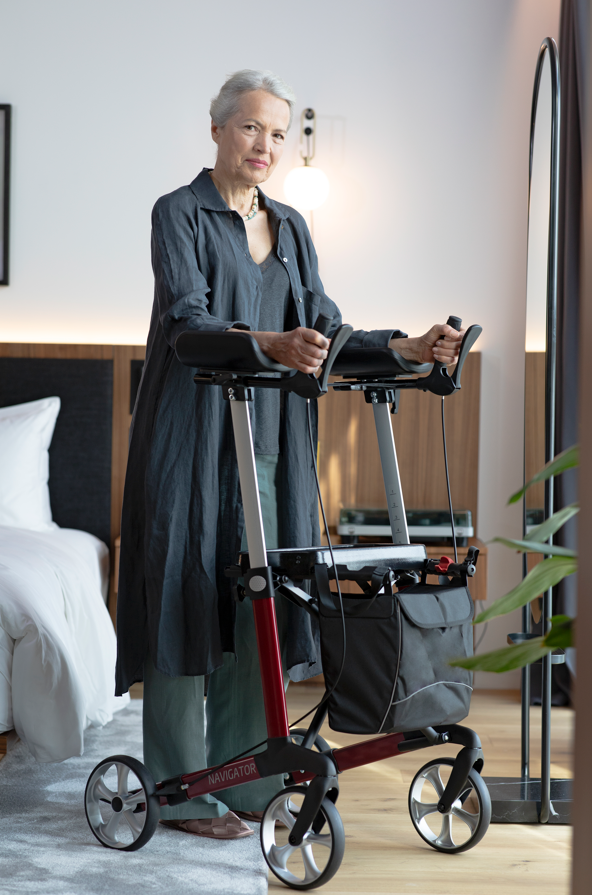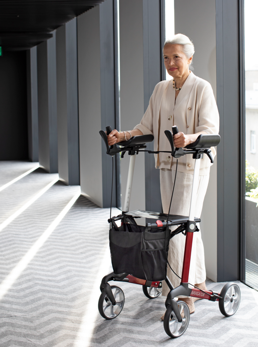 瑞云-航海家是為患有關(guān)節(jié)炎或手部功能受限的用戶開發(fā)的助行器,兼具功能性與舒適性。 前臂支撐架主要由大尺寸的海綿墊和手剎組成,用戶通過(guò)手臂的力量推動(dòng)助行器前行,有固定式和旋轉(zhuǎn)式兩種類型可旋轉(zhuǎn)的支撐架有三個(gè)調(diào)節(jié)角度,滿足不同用戶的需求。