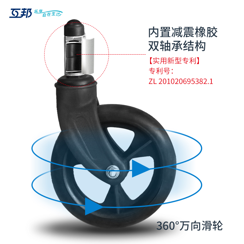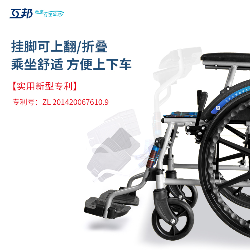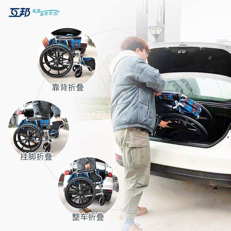 互邦手動輪椅L33,車架采用鋁合金材質(zhì),整車僅重11KG,單手可提,活動掛腳,折疊小巧不占地,狹窄空間也能收納。