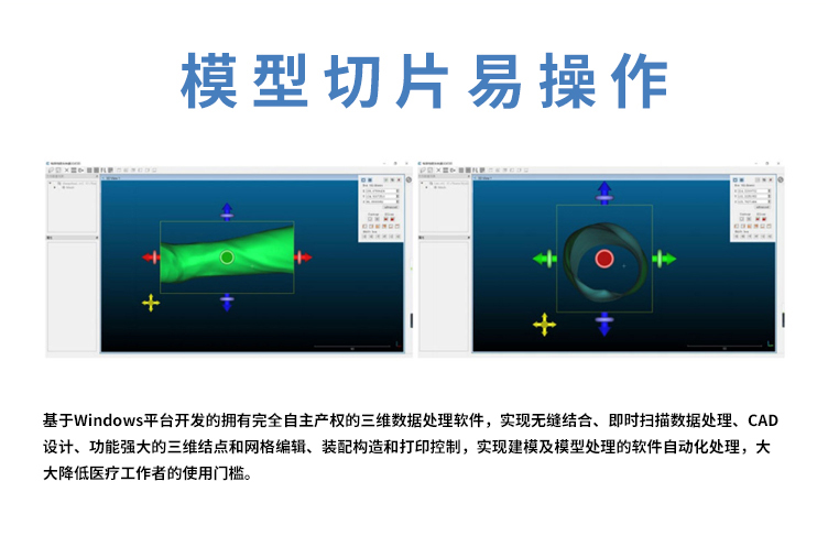 基于Windows平臺(tái)開(kāi)發(fā)的擁有完全自主產(chǎn)權(quán)的三維數(shù)據(jù)處理軟件,實(shí)現(xiàn)無(wú)縫結(jié)合、即時(shí)掃描數(shù)據(jù)處理、CAD設(shè)計(jì)、功能強(qiáng)大的三維結(jié)點(diǎn)和網(wǎng)格編輯、裝配構(gòu)造和打印控制,實(shí)現(xiàn)建模及模型處理的軟件自動(dòng)化處理,大大降低醫(yī)療工作者的使用門(mén)檻。