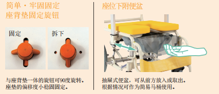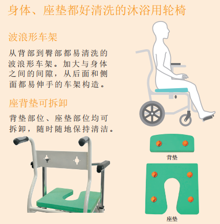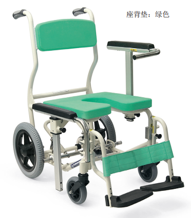 身體、座墊都易清洗的沐浴用輪椅,波浪形車架,加大了與身體之間的間隙,從后面或者側(cè)面都易伸手清潔身體??刹鹦兜娜彳汦VA座背墊,親膚防滑易清潔?;顒?dòng)扶手和活動(dòng)腳,方便移乘,腳踏式剎車,方便安全。帶應(yīng)急用便盆。