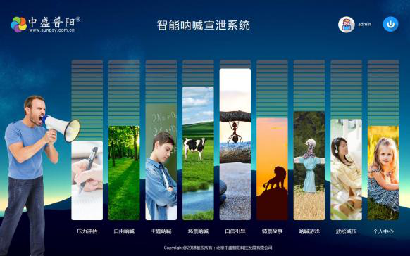 核心功能: 系統(tǒng)內(nèi)置權(quán)威的壓力測試評估工具,可以有效評估用戶當(dāng)前的壓力狀態(tài)、壓力等級,自動出報告,推薦用戶恰當(dāng)?shù)男狗桨?。系統(tǒng)通過采集吶喊聲音與系統(tǒng)內(nèi)容進(jìn)行實時動態(tài)交互,不僅能與高山、瀑布、大海等自然場景進(jìn)行智能互動,還能進(jìn)行壓力宣泄、戰(zhàn)勝自卑、告別抑郁等專題進(jìn)行專業(yè)心理問題處理,更精心設(shè)計了張飛喝退曹兵、獅子王辛巴、戰(zhàn)勝惡龍、幫助外星人返航等帶有故事情節(jié)的趣味游戲。