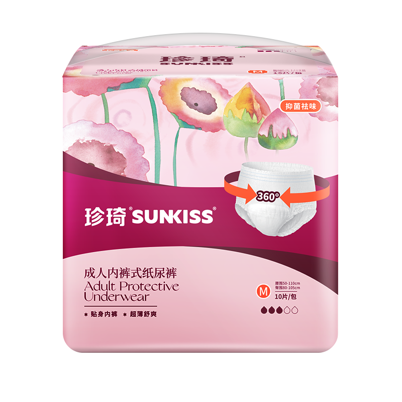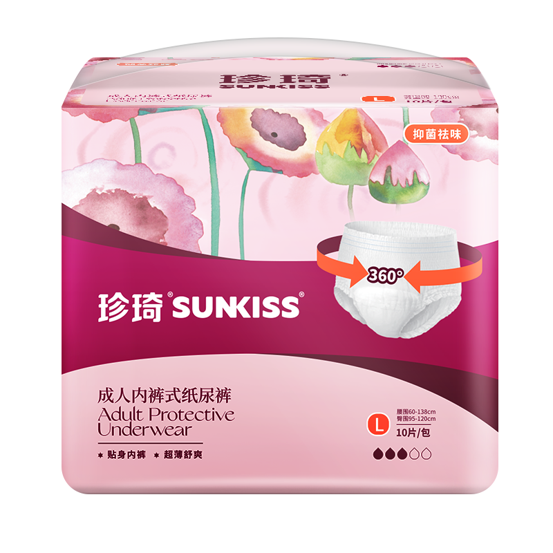 珍琦花樣倍護(hù)成人內(nèi)褲式紙尿褲 ① 高效吸收芯體:進(jìn)口優(yōu)質(zhì)絨毛漿搭配高鎖水性SAP,雙芯速吸,更高吸收量,更強(qiáng)鎖水性 干爽舒適低回滲 ② 納米透氣底膜:納微孔遍布底膜,及時(shí)排出悶濕氣,營(yíng)造舒爽小氣候