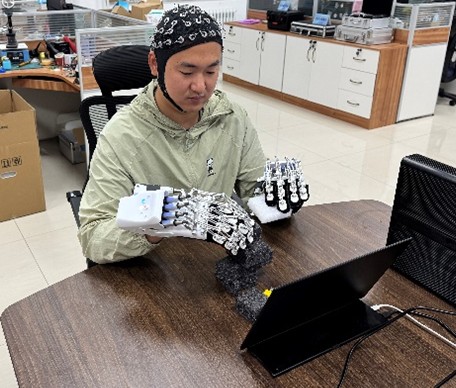 基于自主研發(fā)的輕量化可穿戴康復機械,開發(fā)了基于腦機接口的腦控協(xié)同康復機械手系統(tǒng),并作為2025年世界機器人大賽-BCI腦控機器人大賽賽事平臺之一。該系統(tǒng)通過非侵入式SSVEP技術(shù),控制康復機械手完成抓握、捏取、雙手協(xié)作等動作訓練,促進神經(jīng)功能重塑與運動功能重建。
