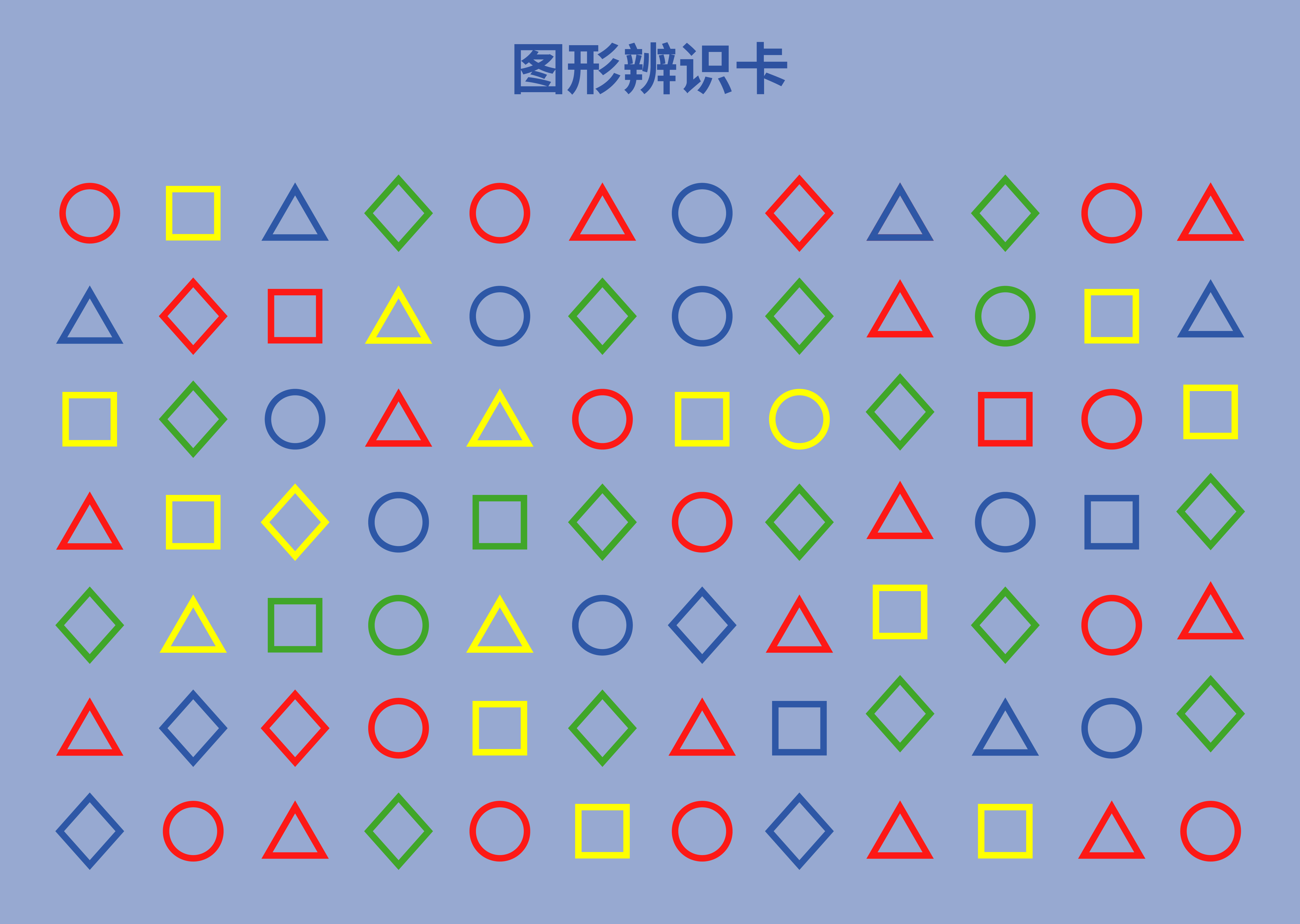 圖形辨識卡是一張訓練卡,7行12列,上面分別以圓形、三角形、正方形、菱形,四種圖形呈現。它的游戲規(guī)則是當遇到圓形時拍手1下,當遇到正方形時拍桌子1下,當遇到三角形時拍腿1下,當遇到菱形時連拍手2下,訓練循序漸進展開,直到老年人能獨立完成整套訓練卡游戲。通過圖形辨識卡,能有效鍛煉老人的手指靈活性,提升老人的空間感和反應力,鍛煉大腦活力和認知水平。