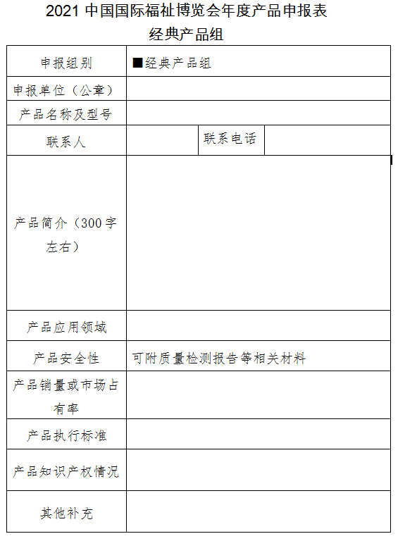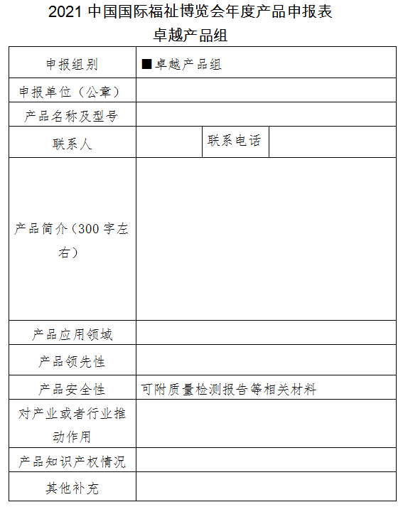 1.填寫《2021中國國際福祉博覽會年度產(chǎn)品評選活動申報表》(見附件1、2,申報表加蓋公章)。