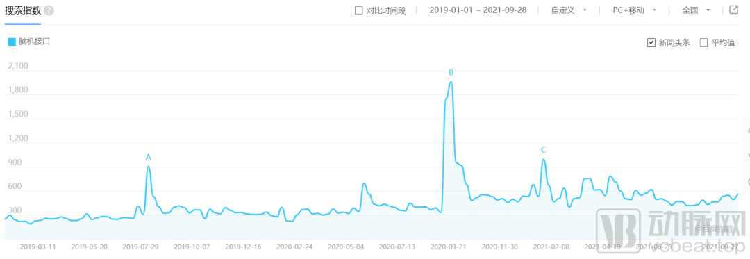 “腦機(jī)接口”搜索指數(shù)(幾次峰值均與Neuralink新聞有關(guān)) 圖源:百度指數(shù)