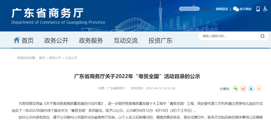 為進一步做好貿易高質量發(fā)展十大工程中“粵貿全國”工程,廣東省商務廳委托第三方機構通過競爭性比選的方式選定了一批2022年國內線下展會作為“粵貿全國”系列展會。