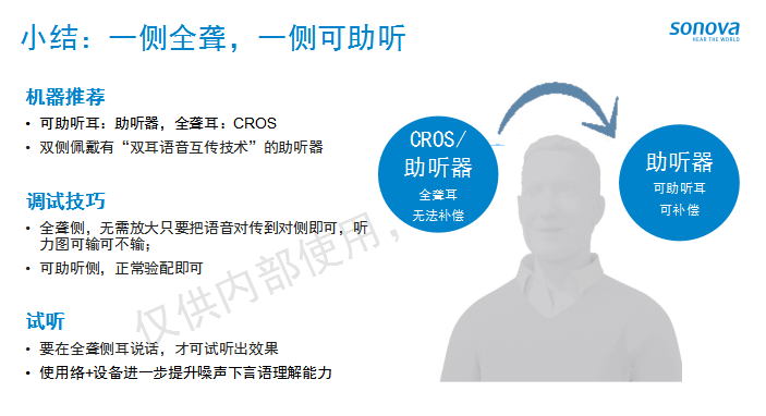 非對稱性聽力損失主要有兩種類型,一種為一側全聾,一側可助聽;另一種為雙側都可助聽但有較好耳。分享會上,孫靜分別為我們介紹了兩種類型的主要解決方案,并提出面對非對稱性聽力損失,不應放棄雙耳驗配,要積極發(fā)揮雙耳語音互傳技術實現(xiàn)“BICROS”功能。