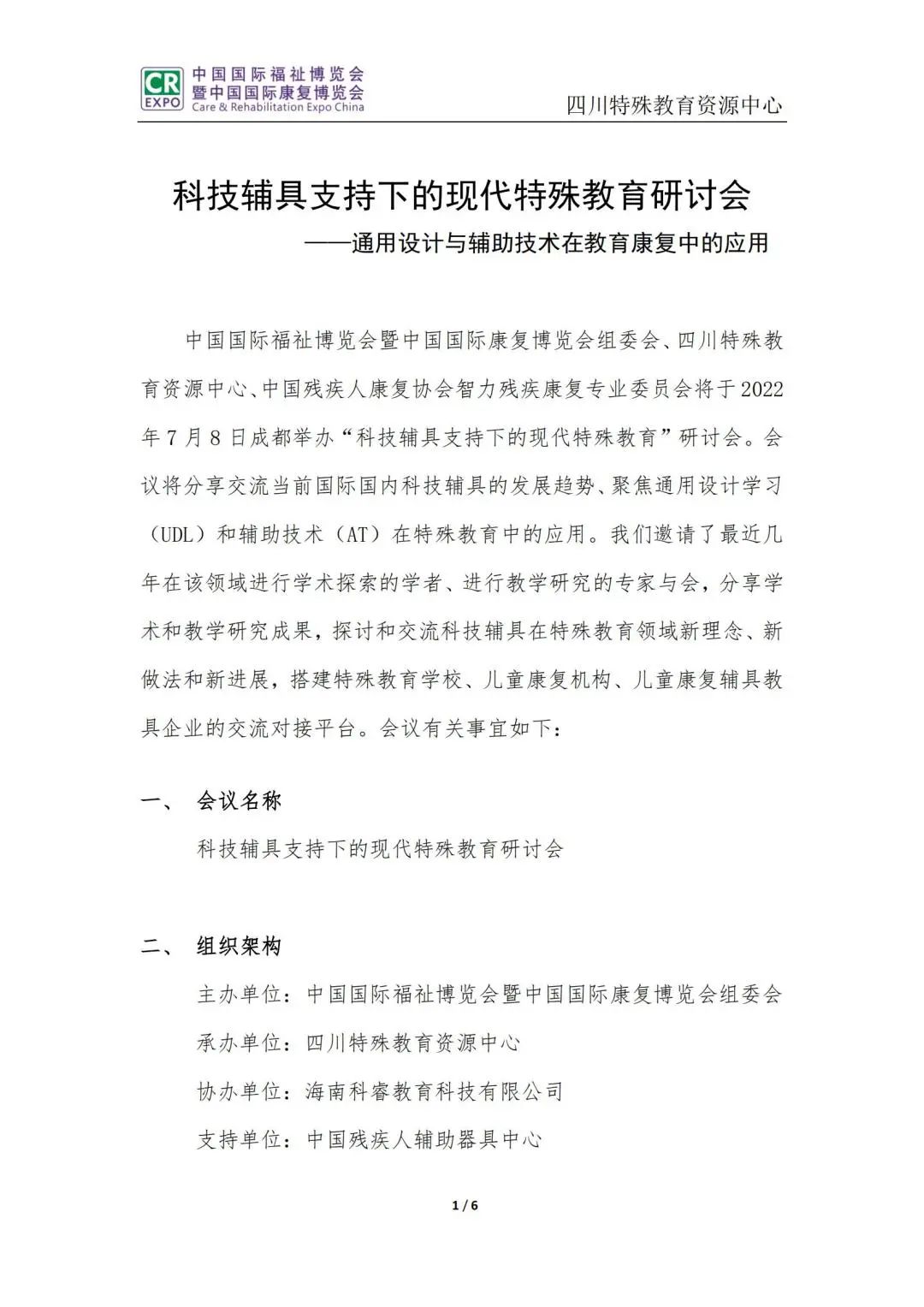 基于此,中國國際福祉博覽會暨中國國際康復(fù)博覽會組委會聯(lián)合四川特殊教育資源中心、中國殘疾人康復(fù)協(xié)會智力殘疾康復(fù)專業(yè)委員會,將于2022年7月8日在成都舉辦“科技輔具支持下的現(xiàn)代特殊教育”研討會,邀請專家學(xué)者分享學(xué)術(shù)和教學(xué)研究成果,探討和交流科技輔具在特殊教育領(lǐng)域新理念、新做法和新進(jìn)展,搭建特殊教育學(xué)校、兒童康復(fù)機(jī)構(gòu)、兒童康復(fù)輔具教具企業(yè)的交流對接平臺。會議詳情如下: