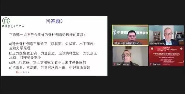 各位專家及業(yè)內(nèi)人士在此交流平臺(tái)上進(jìn)行學(xué)術(shù)分享,討論區(qū)交流互動(dòng)氛圍濃厚,論壇取得了圓滿成功,讓關(guān)注青少年脊柱健康的人士對(duì)相關(guān)知識(shí)有了一定的了解。我們希望以此為契機(jī),相關(guān)專業(yè)、相關(guān)機(jī)構(gòu)互相合作,共同促進(jìn)國(guó)內(nèi)青少年特發(fā)性脊柱側(cè)彎康復(fù)工作的開展。