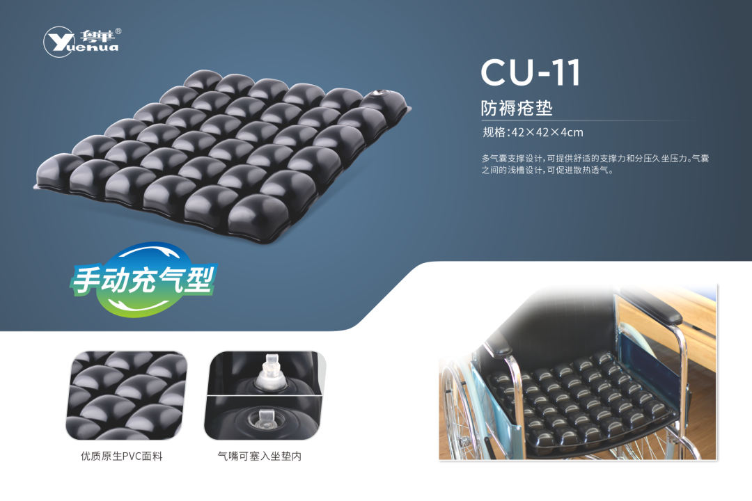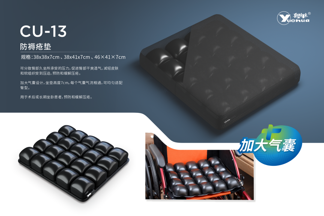 防褥瘡墊CU-11,多氣囊支撐設(shè)計(jì),可提供舒適的支撐力和分壓久坐壓力。氣囊之間的淺槽設(shè)計(jì),可促進(jìn)散熱透氣。