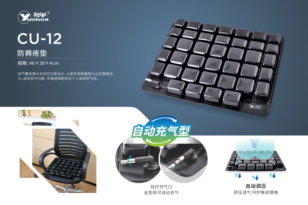 防褥瘡墊CU-12,多氣囊支撐與半記憶功能設(shè)計(jì),以更好適配臀型與分壓臀部壓力。自動(dòng)充氣功能,可便捷調(diào)配適合個(gè)人體感的氣壓。