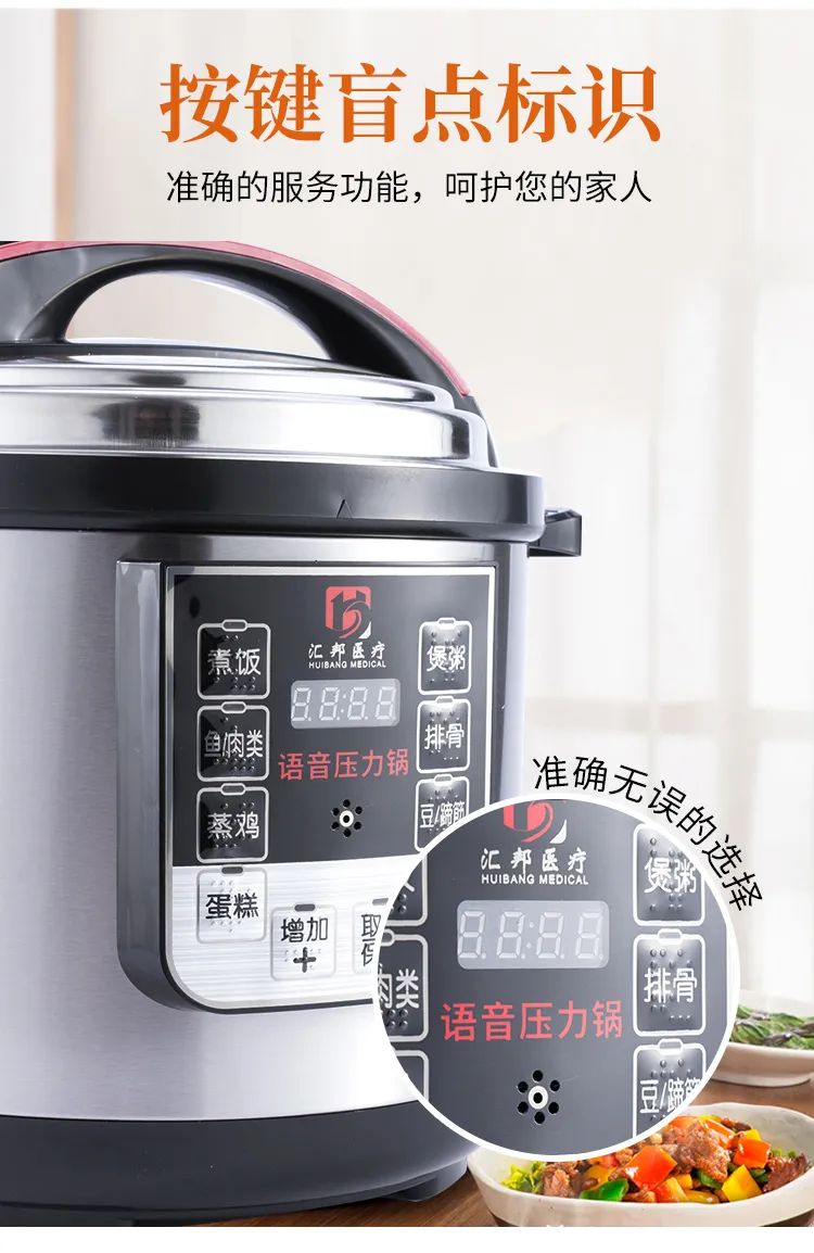 每一個操作按鍵都具有語音報讀功能,以及盲文點標識和LED指示燈;具有LED四位數(shù)碼顯示屏,可顯示時間信息;材質(zhì):不銹鋼外殼,不銹鋼蓋子,食品級塑料蓋子防護,鋁合金內(nèi)膽;具有一鍵式功能選擇鍵:具有煮飯、煲粥、魚/內(nèi)類、排骨、蒸雞、豆/蹄筋、蛋糕、收汁入味八種功能可選擇。