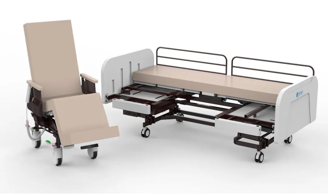多功能康復(fù)護(hù)理床包括床體部分和輪椅部分,能夠?qū)崿F(xiàn)床體部分與輪椅部分的合體和分離。在合體狀態(tài)下,床體部分和輪椅部分可作為一個(gè)整體,具備一定的護(hù)理功能,能夠?qū)崿F(xiàn)患者的臥姿、起背和曲腿等姿勢(shì)的調(diào)整。在分離狀態(tài)下,患者可由醫(yī)護(hù)人員從床體平移到輪椅上,此時(shí)的輪椅處于展平狀態(tài),患者可躺臥在上面,當(dāng)需要轉(zhuǎn)移患者時(shí),可收合輪椅,使患者處于坐姿狀態(tài)。能夠通過(guò)合體或分離實(shí)現(xiàn)患者的自由轉(zhuǎn)移。
