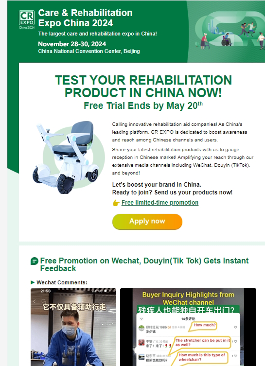 目前CR福祉博覽會在海外推廣上全力出擊,通過海外社媒、線上精準(zhǔn)營銷、EDM營銷、海外展會等多渠道推廣,將更多國際買家“引進(jìn)來”,推動更多展商“走出去”!