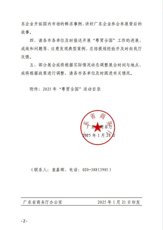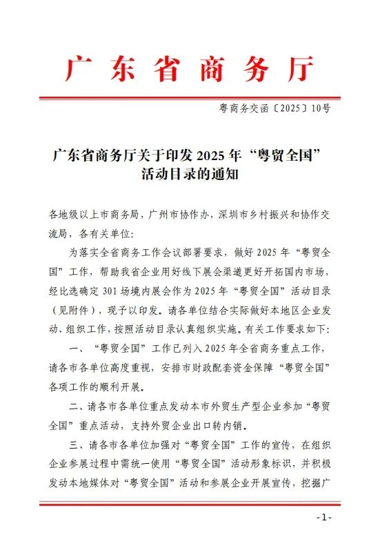 據(jù)了解,“粵貿(mào)全國(guó)”是廣東省政府為推動(dòng)貿(mào)易高質(zhì)量發(fā)展而實(shí)施的一項(xiàng)重大工程,旨在通過(guò)一系列展會(huì)活動(dòng),幫助企業(yè)拓展市場(chǎng)、提升品牌影響力,進(jìn)一步推動(dòng)廣東省乃至全國(guó)的經(jīng)濟(jì)發(fā)展。入圍展會(huì)將列入2025年全省商務(wù)重點(diǎn)工作,并優(yōu)先獲得政府相關(guān)政策扶持。
