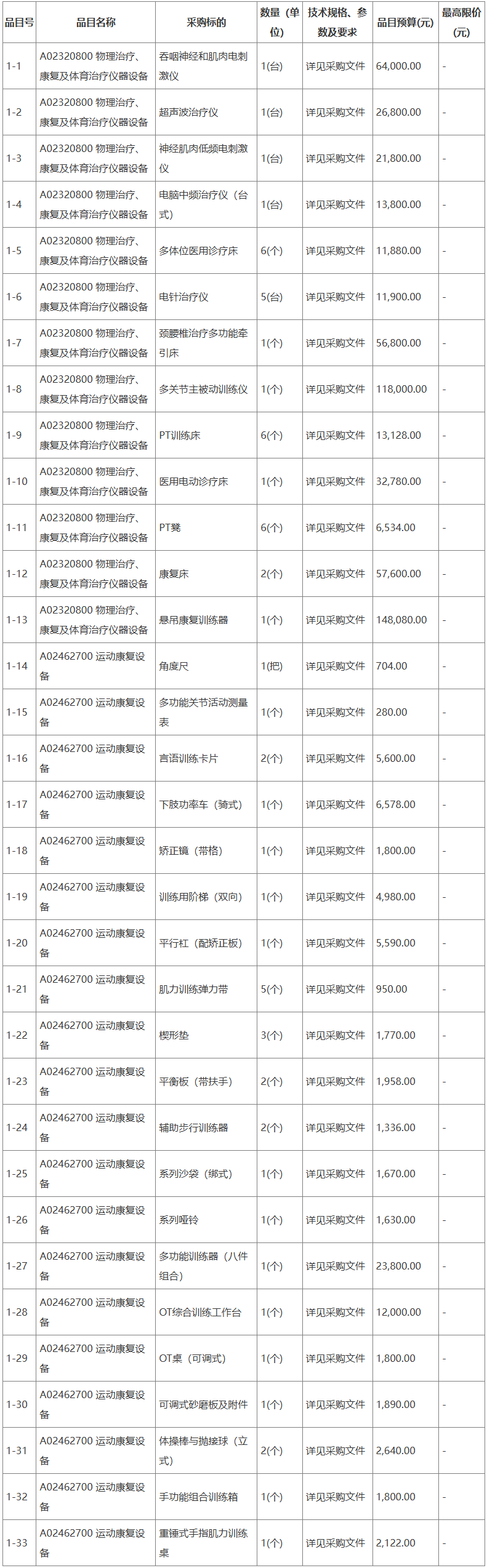 采購需求:購置臥式踏車(含多導(dǎo)心電、血壓、血氧)2臺,運(yùn)動訓(xùn)練控制系統(tǒng)1臺,減重步態(tài)康復(fù)平臺 (成人+兒童)1臺,多點(diǎn)多軸懸吊訓(xùn)練系統(tǒng)1臺,持續(xù)被動關(guān)節(jié)活動儀(CPM機(jī)/下肢連續(xù)被動訓(xùn)練儀)1臺,康復(fù)訓(xùn)練床(可升降)5臺,電動起立床4臺,經(jīng)顱磁刺激儀1臺,可調(diào)式砂磨板及附件1臺,訓(xùn)練套圈2臺,模擬生活作業(yè)訓(xùn)練套件1臺,花生球6臺,大龍球(巴氏球)6臺,沙袋車2臺,握力計(jì)2臺,木插板2臺,手指階梯2臺,上螺絲2臺,上螺母2臺,系列啞鈴2套,OT桌4臺
