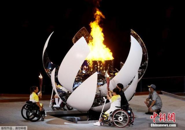8月24日,日本東京,2020東京殘奧會開幕式在東京新國立競技場舉行。圖為殘奧會火炬點火。