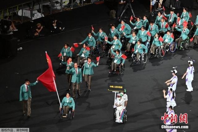 與東京奧運會開幕式一樣,2020東京殘奧會開幕式也采取無觀眾形式。中國代表團(tuán)在“雙旗手”女子輪椅射箭運動員周佳敏、男子肢殘?zhí)飶竭\動員王浩的帶領(lǐng)下入場。