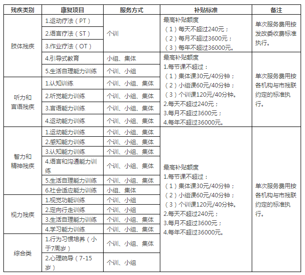聽力、言語、肢體(含腦癱)、智力、多重殘疾兒童和孤獨癥兒童每月最高補貼2400元,每年最高補貼24000元。