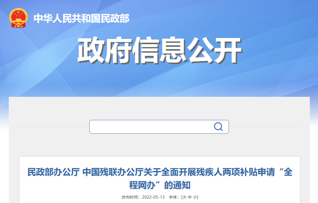 民政部辦公廳 中國殘聯(lián)辦公廳關(guān)于全面開展殘疾人兩項補貼申請“全程網(wǎng)辦”的通知