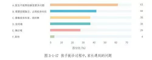 例如,當(dāng)問(wèn)及診療過(guò)程中的困難時(shí),63%的家長(zhǎng)認(rèn)為,“醫(yī)生不能解答更多問(wèn)題”,是就診過(guò)程中遇到的最多的困難,44%的家長(zhǎng)認(rèn)為,“需要定期復(fù)診,占用較多時(shí)間”。“醫(yī)生不能解答更多問(wèn)題”的原因可能是,兒童發(fā)展障礙的共患病問(wèn)題較多,很多情況下,單一科室的醫(yī)生難以給予精準(zhǔn)的診斷治療,因此,需要多學(xué)科間的協(xié)作。