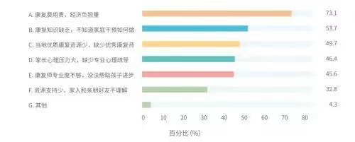 總體來(lái)看,康復(fù)費(fèi)用貴、康復(fù)資源少,服務(wù)質(zhì)量不夠高是家長(zhǎng)們普遍面臨的問(wèn)題。《藍(lán)皮書(shū)》顯示,73.1%的家長(zhǎng)認(rèn)為“康復(fù)費(fèi)用貴,經(jīng)濟(jì)負(fù)擔(dān)重”是主要困難。其次是“康復(fù)知識(shí)缺乏,不知道家庭干預(yù)如何開(kāi)展”,占比 53.7%,以及“當(dāng)?shù)貎?yōu)質(zhì)康復(fù)資源少,缺少優(yōu)秀康復(fù)師”占比 49.7%。