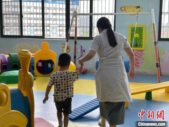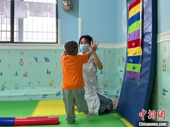 圖為康復(fù)教師帶著孩子進(jìn)行訓(xùn)練,在游戲中鍛煉孩子的聽(tīng)覺(jué)、視覺(jué)、運(yùn)動(dòng)能力等。 朱瑩 攝
