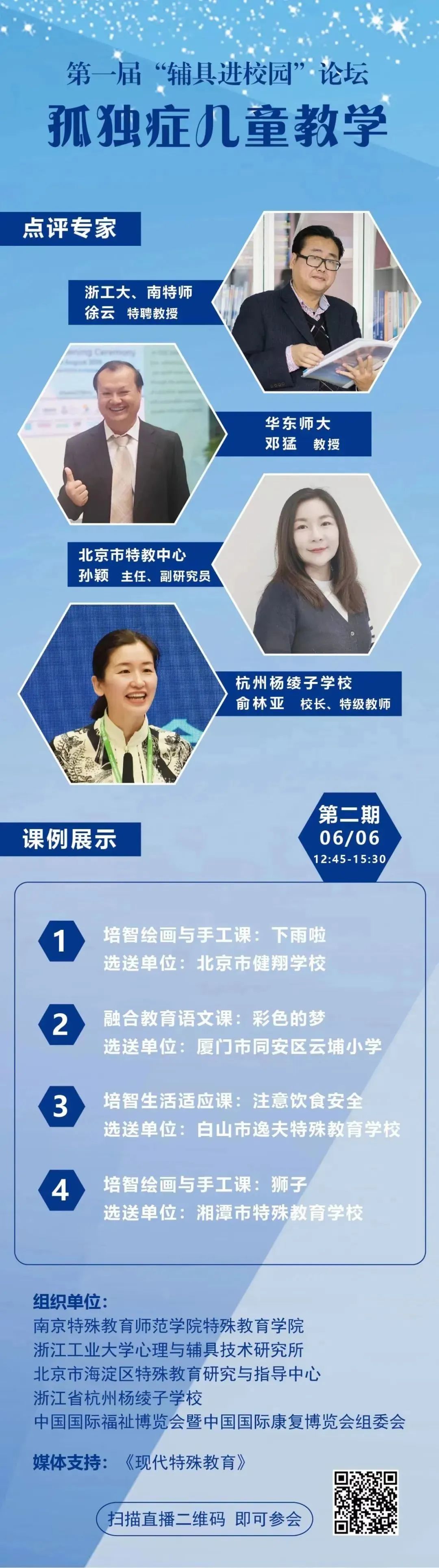 為配合實(shí)施中國(guó)殘聯(lián)、教育部聯(lián)合發(fā)布的《輔助器具進(jìn)校園工程實(shí)施方案》,中國(guó)國(guó)際福祉博覽會(huì)暨中國(guó)國(guó)際康復(fù)博覽會(huì)組委會(huì)聯(lián)合南京特殊教育師范學(xué)院特殊教育學(xué)院、浙江工業(yè)大學(xué)心理與輔具技術(shù)研究所、北京市海淀區(qū)特殊教育研究與指導(dǎo)中心、浙江省杭州楊綾子學(xué)校等“輔具進(jìn)校園”會(huì)議籌備組主辦的“輔具進(jìn)校園”論壇四之“孤獨(dú)癥兒童教學(xué)”主題活動(dòng)擬于2023年6月6日(周二 12:45-16:00)組織召開。具體如下: