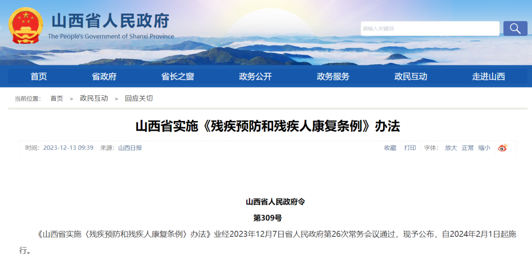 山西省實施《殘疾預(yù)防和殘疾人康復(fù)條例》辦法2月1日起施行