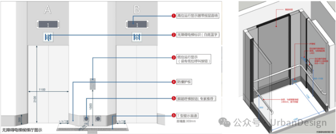 “創(chuàng)新核“建筑群內(nèi)部客梯共計 8 組 11 部 ,提高標(biāo)準(zhǔn)全部設(shè)置為無障礙電梯(圖 12),方便所有人使用,避免區(qū)別對待。電梯口采用八字口,轉(zhuǎn)角進(jìn)行圓角設(shè)計,避免磕碰危險。候梯廳設(shè)置低位呼梯按鈕、提示盲道、運行顯示裝置等,并增設(shè)腳踏按鈕。轎廂內(nèi)設(shè)置低位操作盤、盲文按鍵、三面扶手、鏡面材質(zhì)、報層音響、聲光顯示裝置等。