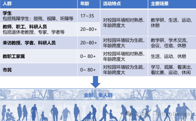 包容性校園的服務(wù)對象不再是少數(shù)殘障或運動損傷學(xué)生,而是擴(kuò)展到全體在校師生及工作人員,以及來往于校園的專家學(xué)者、研究人員及普通市民,即面向全體社會成員,年齡覆蓋全齡(圖 1)。因此,校園環(huán)境在解決殘障群體需求的基礎(chǔ)上,在空間規(guī)劃和設(shè)施供給中,需要考慮校園內(nèi)各類人群學(xué)習(xí)、工作、生活需求及不同的體能特征和認(rèn)知能力,提供多種可供選擇的通行、使用、交互和服務(wù)的方式。