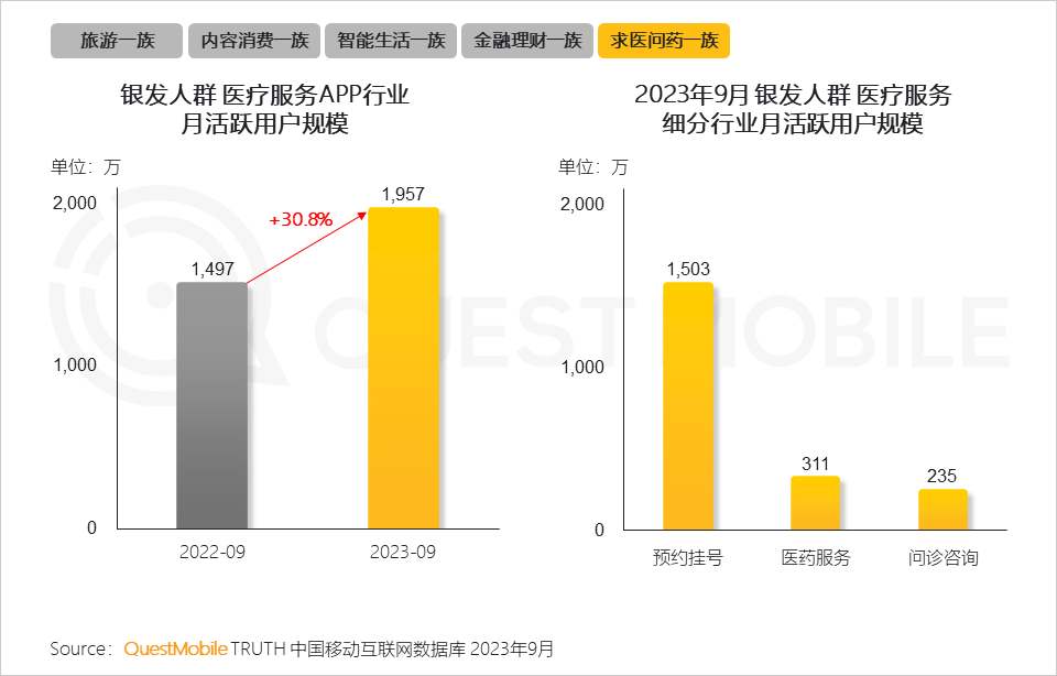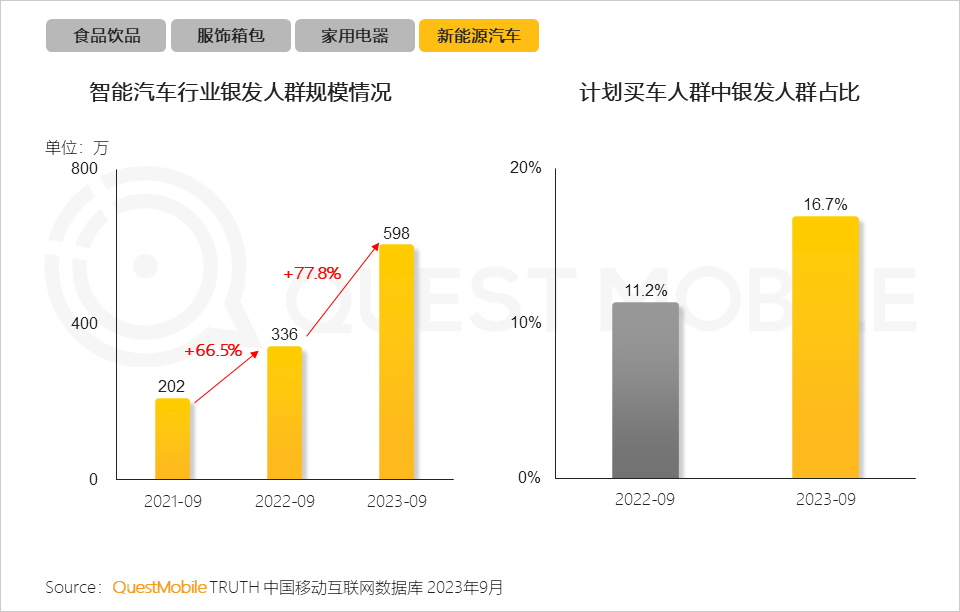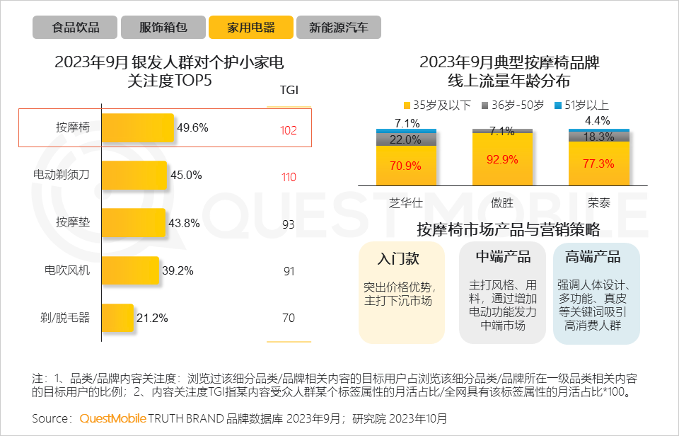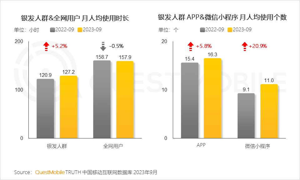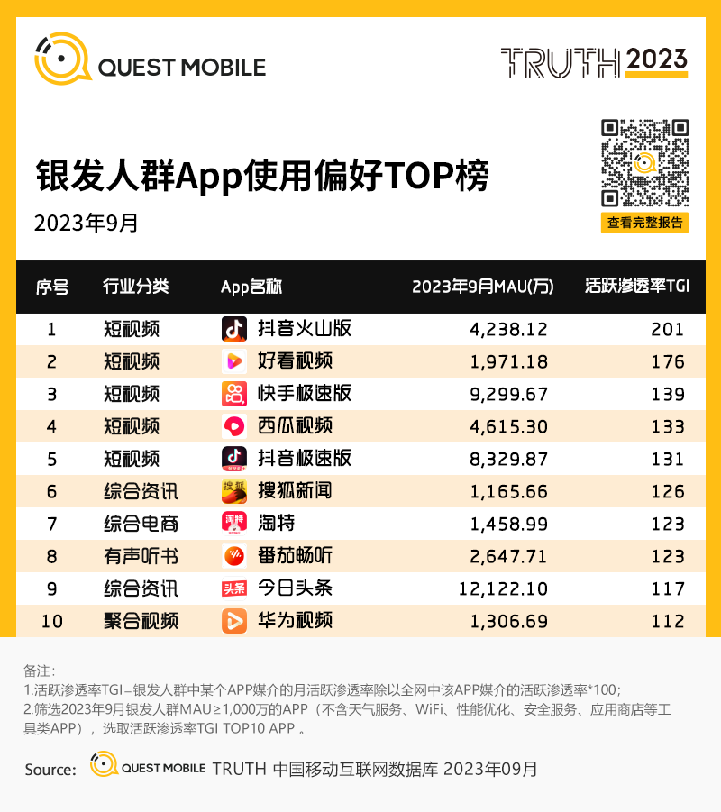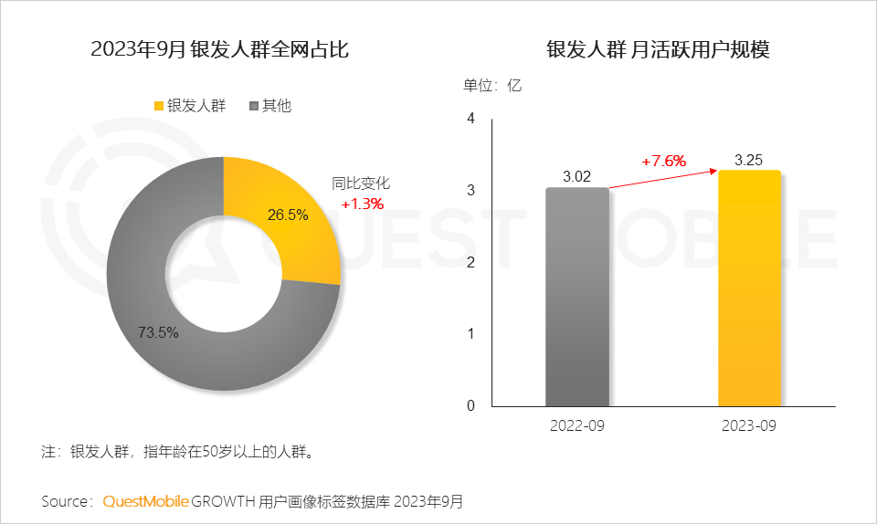 QuestMobile數(shù)據(jù)顯示,截止到2023年9月,銀發(fā)人群用戶規(guī)模已達(dá)到3.25億,同比增長了7.6%;全網(wǎng)占比已經(jīng)達(dá)到26.5%,同比提高了1.3個百分點。同時,銀發(fā)群體線上消費能力、消費意愿也在提升,9月份,銀發(fā)人群千元以上消費能力占比較去年同期增加了1.6%,中高端消費意愿占比較去年同期增加了2.4%。銀發(fā)經(jīng)濟(jì)消費潛力如何挖掘?不妨看報告吧。