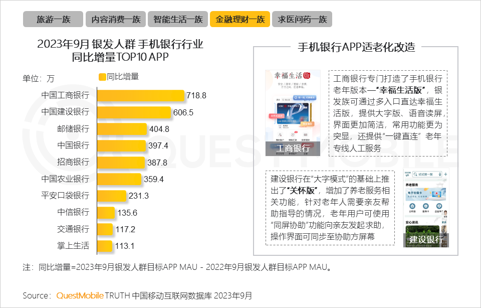 9、移動支付方面,各大國有及股份制銀行加快完成適老化進(jìn)程,各手機(jī)銀行APP紛紛開發(fā)出適合老年群體的專屬界面,為銀發(fā)人群辦理金融業(yè)務(wù)提供更好的體驗,進(jìn)而進(jìn)一步獲得用戶擁躉。