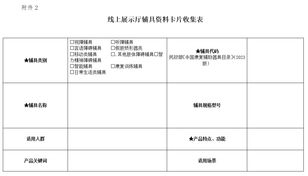 三、請有意向的輔具企業(yè)按照附件1、2提供素材電子文檔,于3月7日前發(fā)省殘疾人輔助器具資源中心,文件包統(tǒng)一命名:企業(yè)簡稱+輔具線上展廳素材+聯(lián)系電話,電子郵箱:492440744@qq.com。