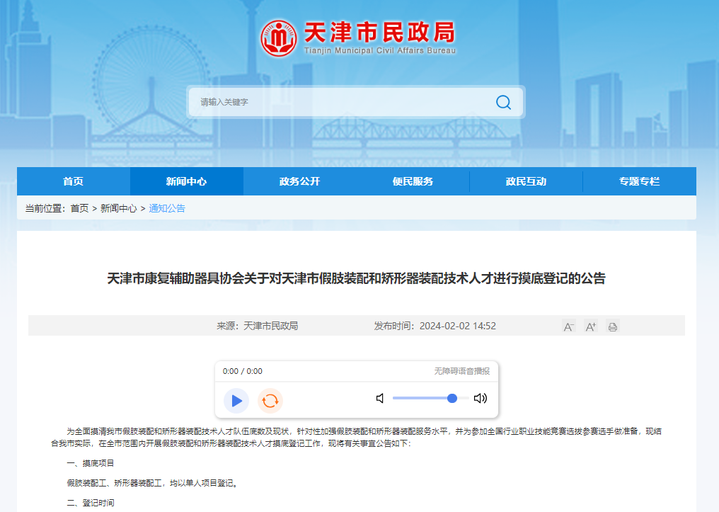 近日天津市康復(fù)輔助器具協(xié)會發(fā)布公告,在全市范圍內(nèi)開展假肢裝配和矯形器裝配技術(shù)人才摸底登記工作,為全面摸清我市假肢裝配和矯形器裝配技術(shù)人才隊伍底數(shù)及現(xiàn)狀,針對性加強假肢裝配和矯形器裝配服務(wù)水平,并為參加全國行業(yè)職業(yè)技能競賽選拔參賽選手做準備。