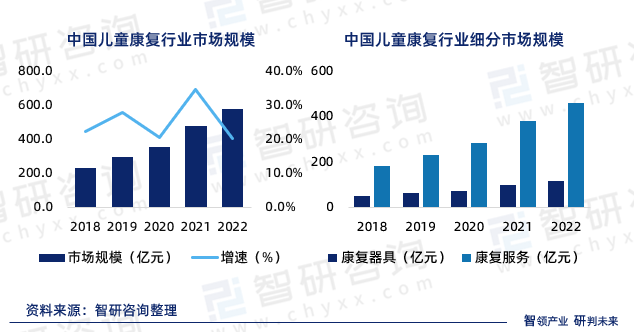 兒童康復市場,除了康復服務,還涉及到各種康復設備和產(chǎn)品的銷售,包括輔助器具、特殊床位、運動訓練器材、沙床、言語輔助設備等。2022年我國兒童康復器具市場規(guī)模約為117.1億元,兒童康復服務市場規(guī)模約為461.6億元。