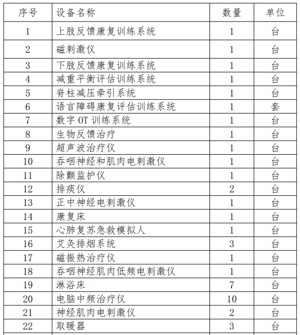 采購需求:三維干擾電治療儀、中低頻治療儀、磁振熱治療儀、沖擊波物理治療系統(tǒng)、空氣波壓力循環(huán)治療儀、超激光疼痛治療儀、電動牽引床、訓練用扶梯(雙向)、聯動升降平行杠、肋木(帶肩梯)、升降單人站立架、抽屜式階梯、股四頭肌訓練板、簡易運動訓練套裝、踝關節(jié)矯正板、矯正鏡、醫(yī)師椅(不帶靠背)、診療臺、角度尺、楔形墊、手支撐器、分指板、滾筒、OT綜合訓練臺、上下肢主被動訓練系統(tǒng)、床邊下肢主被動訓練系統(tǒng)、上肢康復機器人、腕關節(jié)智能康復機器人、踝關節(jié)智能康復機器人、小數字OT訓練系統(tǒng)、數字OT評估與訓練系統(tǒng)、外骨骼:步態(tài)與平衡功能訓練評估系統(tǒng)、生物反饋刺激儀(吞咽成人版)、BOBATH床、三段多體位治療床、電動起立床、脈沖針灸治療儀、特定電磁波治療器(TDP)、手搖式病床、床頭柜、多參數監(jiān)護儀、微量注射泵,詳見招標文件第二章采購需求。