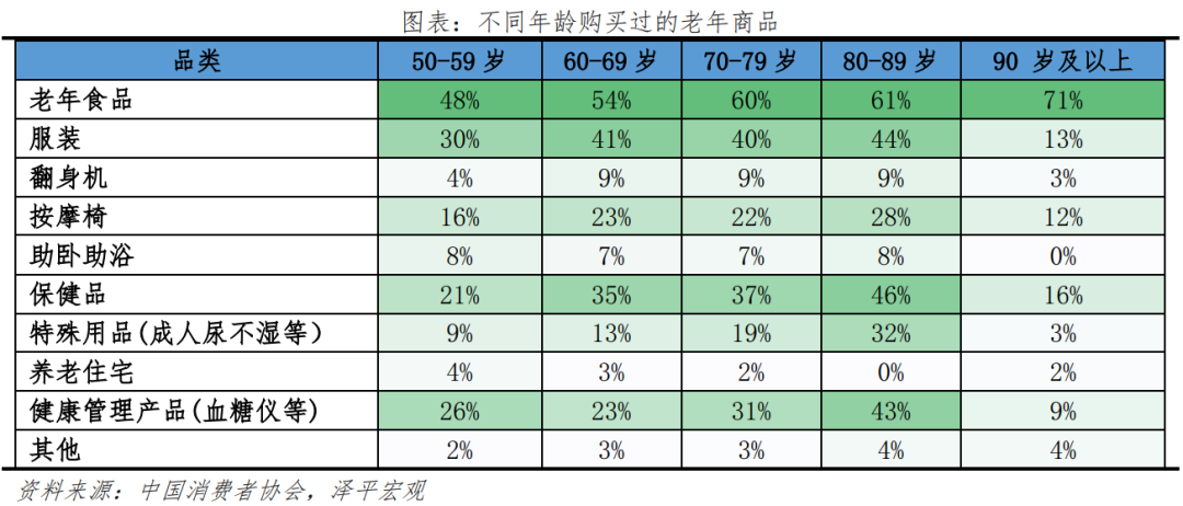 2)分年齡看,低齡老人需要消費、社交、娛樂,高齡老人需要照護服務,長壽老人關(guān)注身體機能變化等方面。傳統(tǒng)老年人口劃分為60歲及以上或65歲及以上人口,如果考慮備老人群,可把銀發(fā)群體擴展到50歲及以上人群。按年齡劃分,銀發(fā)群體可分為準老人(50-64歲)、低齡老人(65-74歲)、高齡老人(75-89歲)、長壽老人(90歲及以上)。年齡階段不同,老年群體的需求也不盡相同,其中準老人處于職業(yè)生涯晚期,身體相對健康,即將退休,重點關(guān)注文娛、抗衰老等方面;低齡老人剛步入退休階段,處于退休適應期,重點關(guān)注健康管理、娛樂社交等方面,對短途旅行、老年大學等方面的需求增加;高齡老人身體機能減退,自理能力減弱,更加關(guān)注醫(yī)療保健、養(yǎng)老服務等方面;長壽老人更加注重精神層面需求,安享晚年生活。