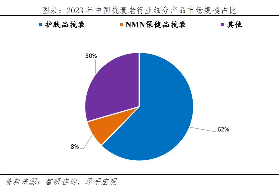 抗衰領(lǐng)域,隨著生活方式和化妝習慣變化,銀發(fā)族對永葆青春渴望推動抗衰老產(chǎn)品銷售增長,預計2024年中國抗衰市場規(guī)模達1500億元。2024年1月,國務院發(fā)布的《關(guān)于發(fā)展銀發(fā)經(jīng)濟增進老年人福祉的意見》中強調(diào):“發(fā)展抗衰老產(chǎn)業(yè),推動生物技術(shù)與延緩老年病深度融合,開發(fā)老年病早期篩查產(chǎn)品和服務。”當前,消費者對抗衰老護膚品的需求日益多元化,市場消費熱情持續(xù)高漲。根據(jù)智研咨詢數(shù)據(jù),2023年中國抗衰老行業(yè)市場規(guī)模約為1522億元,其中,護膚品抗衰老、NMN保健品抗衰、其他抗衰產(chǎn)品占比分別為62%、30%、8%。隨著抗衰老護膚品和保健品成分的迭代升級,越來越多消費者認可抗衰成分的有效性,并通過使用護膚品和保健品進行抗衰老。根據(jù)艾媒咨詢數(shù)據(jù),目前,68.2%的消費者通過健身進行抗衰老,62.4%的消費者使用護膚品,近五成的消費者注重飲食和服用保健品。