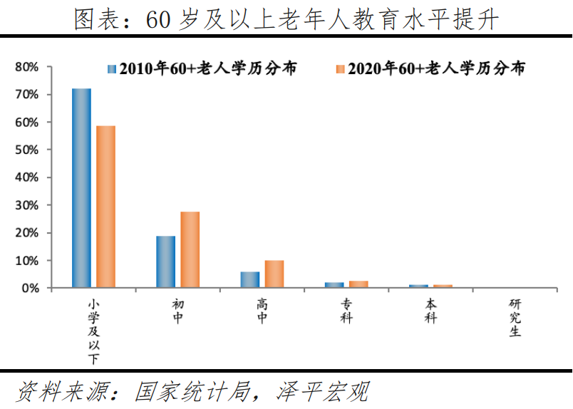 2)老年人綜合素質(zhì)明顯提升,教育水平提升、健康水平提升、壽命延長。